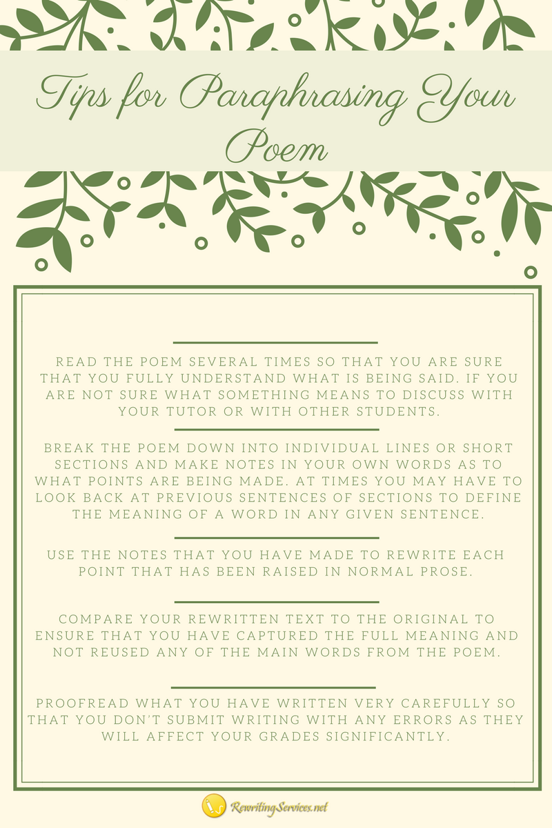 Images. Let our experts do it for you and you will be satisfied with the final results definitely! Paraphrasing a poem is itself a challenging task even for the professional authors.