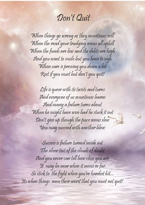 18+ Don T You Quit Poem Images. When things go wrong, as they sometimes will, when the road you're trudging seems all uphill, when the funds are low and the debts are high, and you want to smile, but you have to sigh, when care is pressing you down a bit, rest, if you must, but don't you quit. When things go wrong, as they sometimes will, when the road you're trudging seems all uphill, when funds are low and the debts are high, and you want to smile but you have to sigh, when care is pressing you down a bit, rest if you must, but don't you quit.