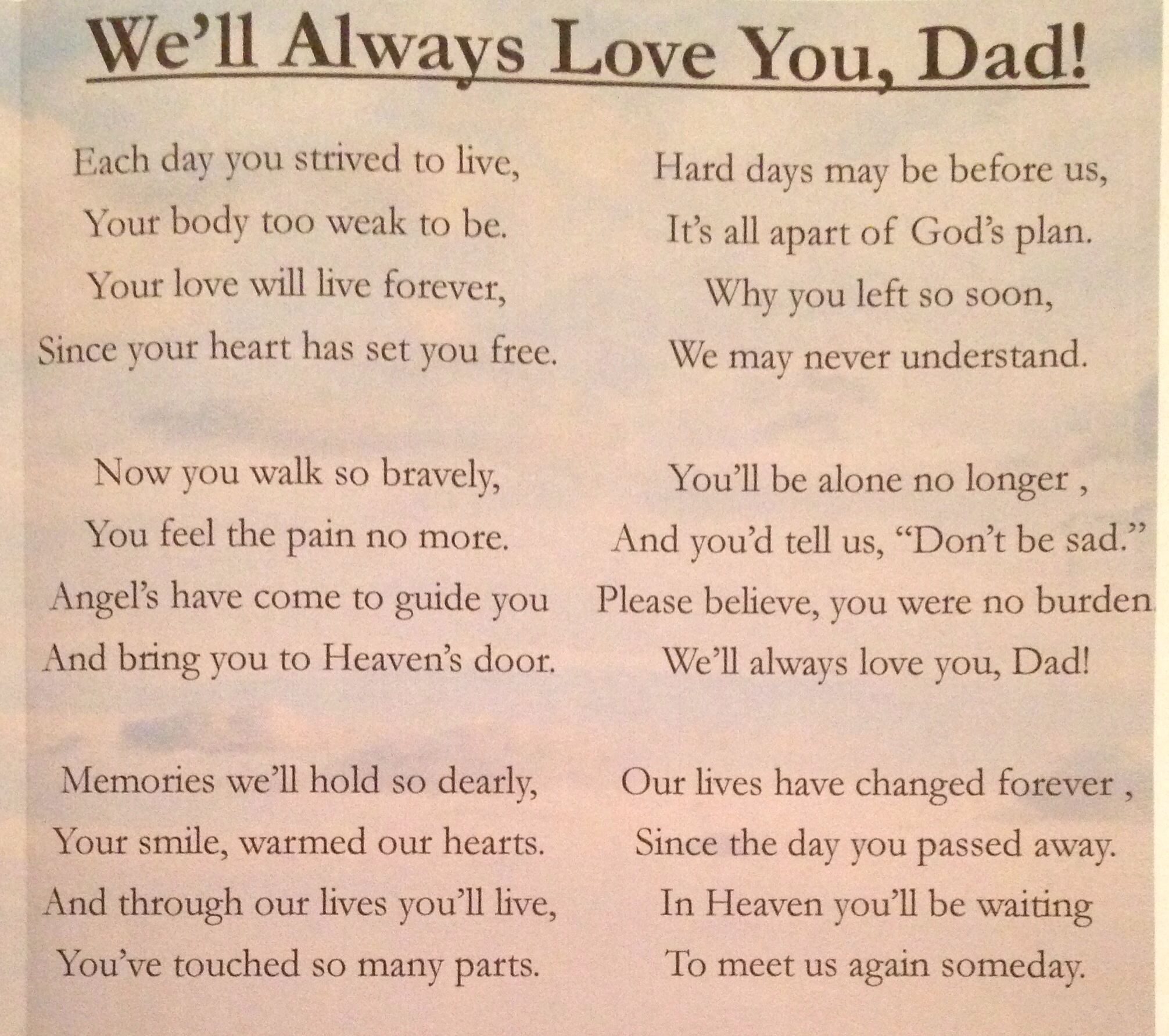 25+ Poems For Fathers Funeral Pics. You never said i'm leaving you never said goodbye you were gone before i knew it, and only god knew why. Are you looking for dad funeral poems for your father's funeral?