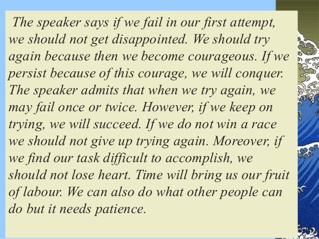 In the poem, try try again, the poet, charles theodore hart palmer, reveals the theme that despite constant failure and laborious obstacles one should always keep trying by using repetition, metaphors, resolute diction, and a courageous tone in order to create a mood of redemption for the reader. So if you no getting what you just try try try and try again. What television commercial features try try again written by t. This request requires quite a bit of work.
